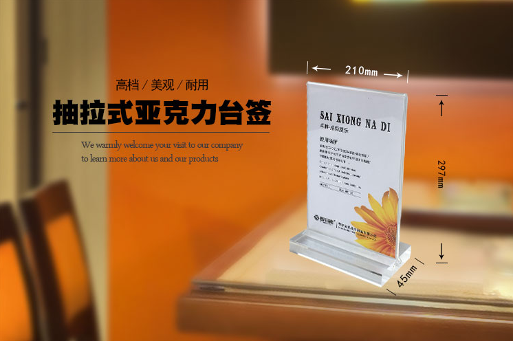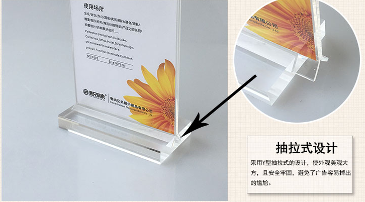(2)亞克力桌牌采用Y型抽拉式設(shè)計,外觀美觀大氣,且安全牢固,避免廣告頁容易掉出的尷尬.